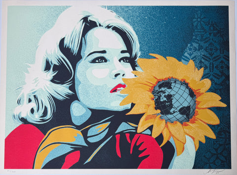 "I've been an admirer at a distance of Jane Fonda's acting and activism for the majority of my life. I had the honor of being included in a Zoom discussion with Jane at the beginning of the pandemic, and we very naturally connected on many of our shared concerns, especially climate change and other environmental issues. I've since collaborated with Jane, brainstorming and creating art for Greenpeace and her environmental PAC. Following Jane inspires me and also humbles me because the extent of her commitment to the causes she believes in is deeper and more rigorous than anyone else I can think of. This portrait of her, which demonstrates grit, determination, and advocacy for the planet, is something I know to be a hundred percent authentic. Yet, it still represents only a fraction of what she embodies. Jane is a leader we'd all benefit from emulating." - Shepard