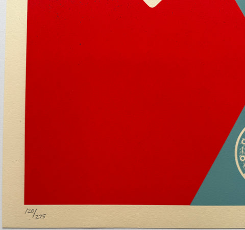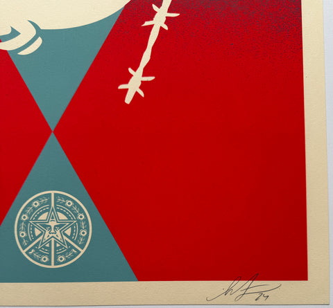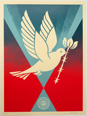"Based on the Peace Dove, a motif I’ve used in several iterations over the years, because as an icon, the dove is internationally recognized as a symbol of peace, making it ideal as a communication tool. With the wars going on in the world, a message of peace is more important now than ever. The peace dove includes a flower growing from the barb wire, symbolizing positive growth from an oppressive situation. In this version of the Barb Wire Dove, I’ve explored a new color and placement by having the gradient of red with spray texture into the blue rays up toward what could be interpreted as the sky to depict the dove rising above the darkness and into a more positive future." - Shepard